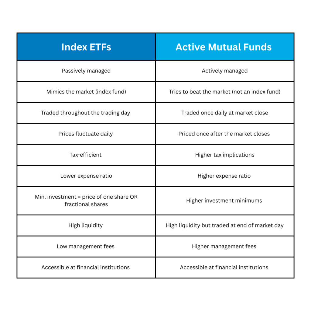 To keep it simple, if you see the word “index,” think passive management. Index funds are investment strategies, and ETFs and mutual funds are two different investment formats that can be index funds.
